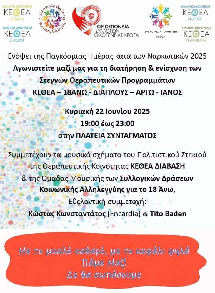 Με αφορμή την Παγκόσμια Ημέρα κατά των Ναρκωτικών, διοργανώνουν δράσεις γεμάτες πείσμα και ελπίδα, δίνοντας και φέτος το «παρών» στον δημόσιο χώρο. Το ΚΕΘΕΑ και τα θεραπευτικά προγράμματα 18Άνω, Διάπλους, Αργώ, Ιανός καλούν σήμερα στη Πλατεία Συντάγματος σήμερα Κυριακή 22 Ιουνίου στιςε 19.00 για τη διατήρηση και ενίσχυση των προγραμμάτων στεγνής θεραπείας. Η εκδήλωση θα πλαισιωθεί καλλιτεχνικά από συγκροτήματα του Καλλιτεχνικού Στεκιού της Θεραπευτικής Κοινότητας ΚΕΘΕΑ Διάβαση και της ομάδας Μουσικής Συλλογικών Δράσεων Κοινωνικής Αλληλεγγύης για το 18 Άνω. Εθελοντική συμμετοχή έχουν ο Κώστας Κωνσταντάτος και ο Tito Baden.