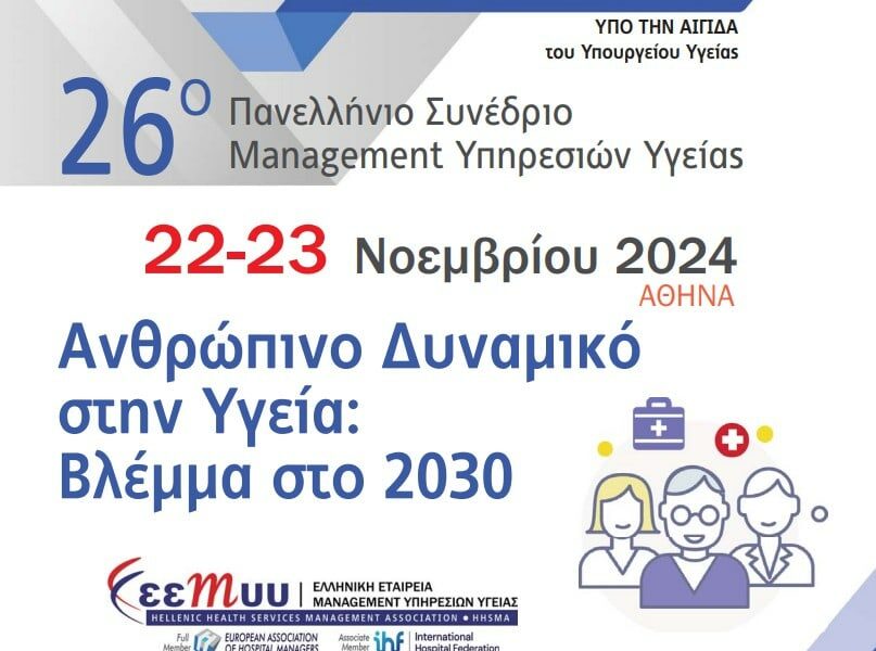 Η Ελληνική Εταιρεία Management  Υπηρεσιών Υγείας διοργανώνει στις 22 και στις 23 Νοεμβρίου 2024 το 26ο Πανελλήνιο Συνέδριο Management Υπηρεσιών Υγείας «Ανθρώπινο Δυναμικό στην Υγεία: Βλέμμα στο 2030».