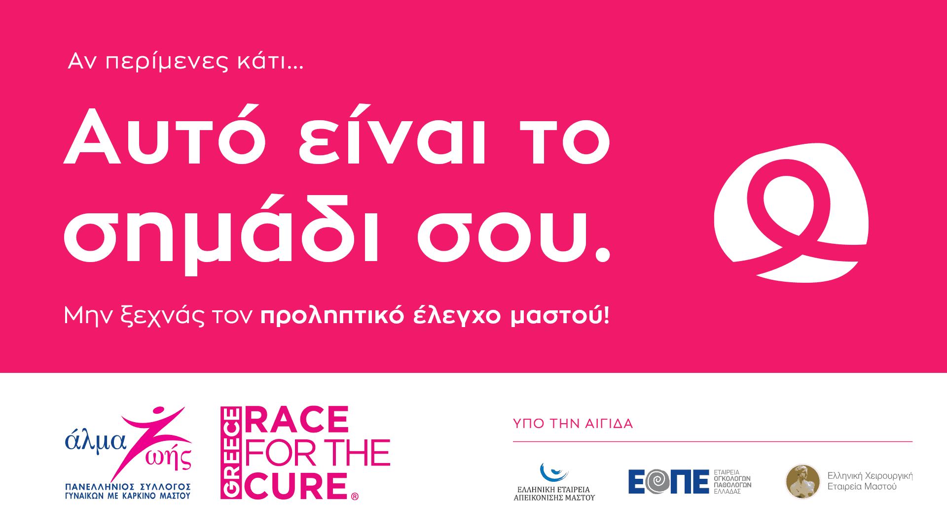 Με αφορμή τον εορτασμό του Οκτωβρίου, ως μήνα ευαισθητοποίησης για τον καρκίνο του μαστού, ο Πανελλήνιος Σύλλογος Γυναικών με Καρκίνο Μαστού «Άλμα Ζωής» υλοποιεί την εκστρατεία ενημέρωσης «Αυτό είναι το σημάδι σου». Ένα ηχηρό μήνυμα στέλνεται σε κάθε γυναίκα: δεν χρειάζεται κάποιο ιδιαίτερο σημάδι για να προχωρήσει στον προληπτικό έλεγχο. Αν περίμενε κάτι, αυτό είναι το σημάδι της.