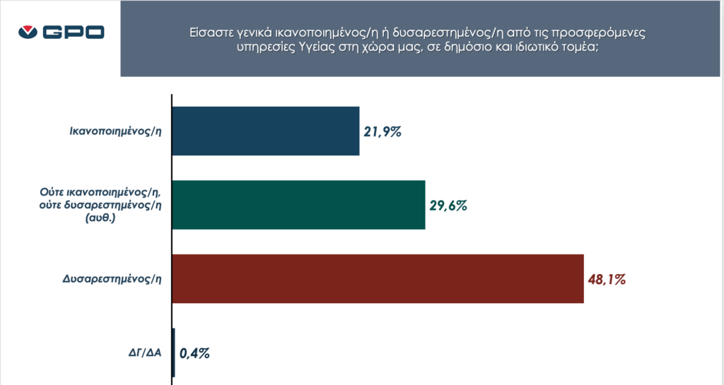 - Περίπου οι μισοί πολίτες (48,1%) δηλώνουν δυσαρεστημένοι από το σύστημα υγείας (δημόσιο και ιδιωτικό) ενώ μόλις 21,9% είναι ικανοποιημένοι. Περισσότεροι δυσαρεστημένοι είναι οι πολίτες στην Περιφέρεια και ειδικά στη Κεντρική Μακεδονία.