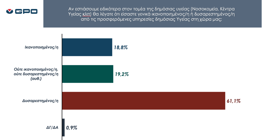 - Ειδικά για το δημόσιο σύστημα υγείας δυσαρεστημένοι δηλώνουν το 61,1% των πολιτών και μόνο 16% ικανοποιημένοι. Από αυτούς, που εμφανίζονται ικανοποιημένοι, στο 83% η ικανοποίηση αφορά το επίπεδο των ιατρών.