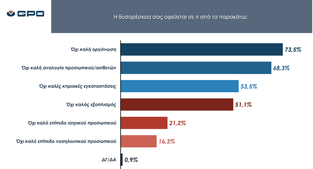 - Οι πολίτες σε ποσοστό 73% εμφανίζονται δυσαρεστημένοι από την κακή οργάνωση του ΕΣΥ και 68,3% από τις ελλείψεις προσωπικού.