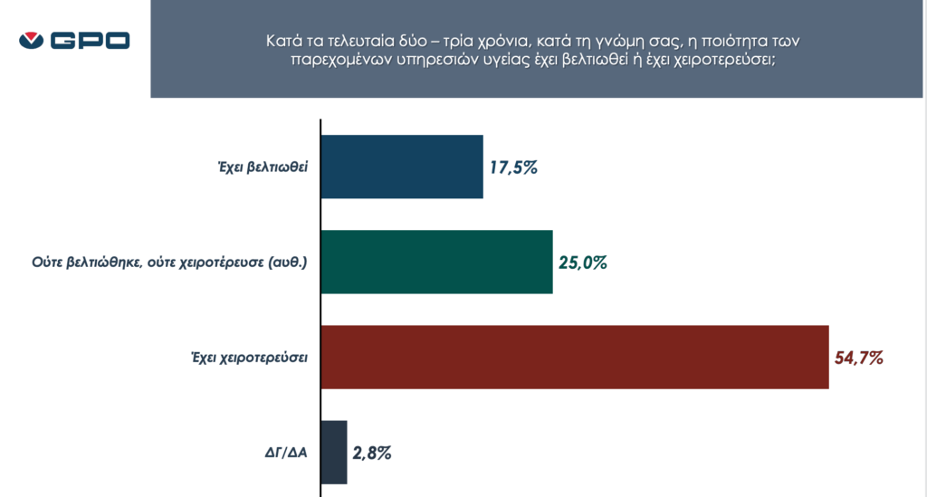- Περισσότεροι από τους μισούς πολίτες (54,7%) δηλώνουν πως έχει χειροτερεύσει η ποιότητα των υπηρεσιών υγείας τα τελευταία 2-3 χρόνια. Εύρημα που αποτελεί κόλαφο για την κυβέρνηση, η οποία δηλώνει ότι η υγεία αποτελεί προτεραιότητα.