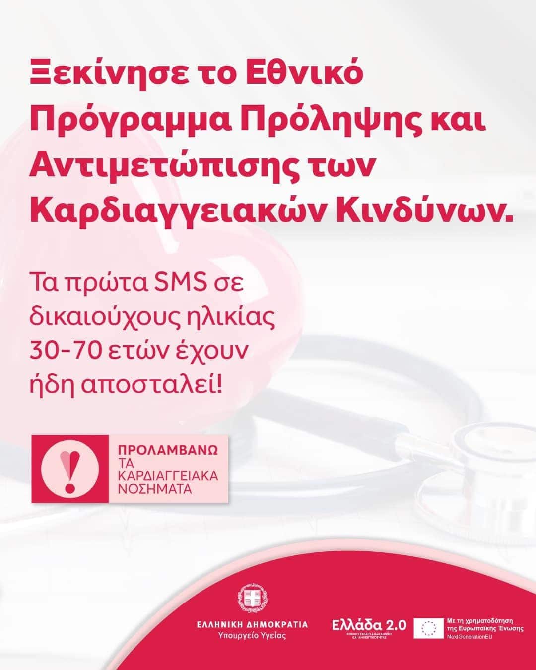 Σήμερα συμπληρώνεται ένας χρόνος από την έναρξη του εθνικού προγράμματος πρόληψης καρδιαγγειακών νοσημάτων, με τα πρώτα ενημερωτικά SMS να αποστέλλονται στους πολίτες. Σύμφωνα με την αναπληρώτρια υπουργό Υγείας Ειρήνη Αγαπηδάκη, μέσα σε 12 μήνες σχεδόν 3 εκατομμύρια πολίτες έχουν πραγματοποιήσει δωρεάν τις προληπτικές εξετάσεις τους, ενώ περίπου 80.000 άτομα εντοπίστηκαν έγκαιρα με συμπτώματα που απαιτούσαν περαιτέρω διερεύνηση.