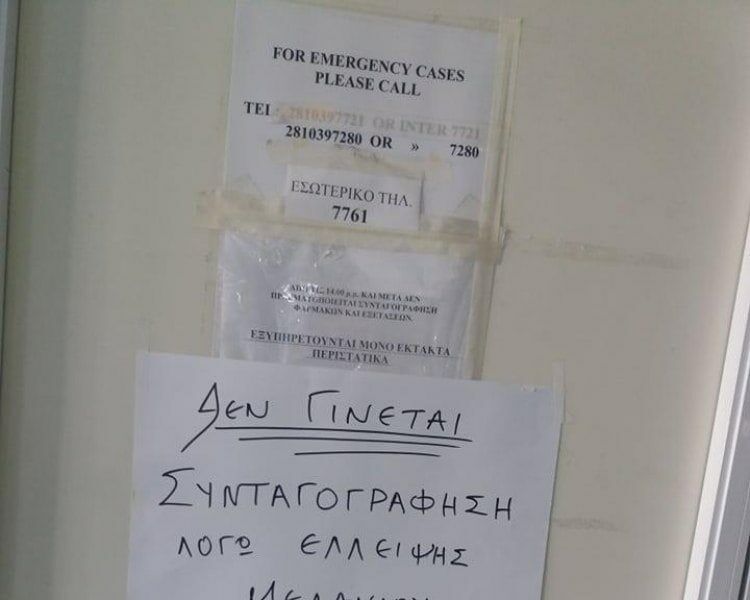 Χειρόγραφο σημείωμα στο ιατρείο του αεροδρομίου Ηρακλείου ενημερώνει ότι δε μπορεί να γίνει συνταγογράφηση γιατί… τέλειωσε το μελάνι!