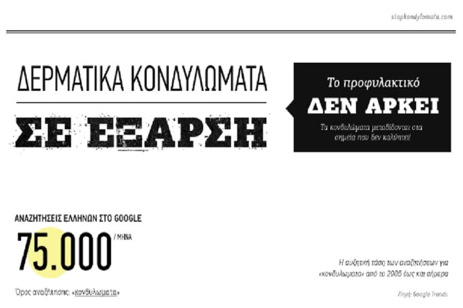 Τα στοιχεία από την Ελλάδα δείχνουν αύξηση των κρουσμάτων, ενώ ακόμη και οι σχετικές αναζητήσεις των Ελλήνων χρηστών στο Google αυξάνονται κάθε χρόνο, φθάνοντας τις 75 χιλιάδες ανά μήνα. Όπως εξηγεί ο Δερματολόγος – Αφροδισιολόγος, Dr. Χριστόφορος Τζερμιάς, τα περιστατικά ασθενών με δερματικά κονδυλώματα που επισκέπτονται τα δερματολογικά ιατρεία, αυξάνονται καθημερινά, κυρίως λόγω της άγνοιας των ασθενών, ότι το προφυλακτικό δεν αρκεί για την πλήρη προστασία από τα κονδυλώματα.