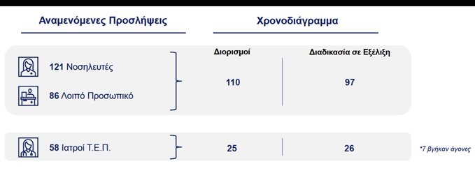 Το Υπουργείο Υγείας σε συνεργασία με το Υπουργείο Εργασίας και Κοινωνικής Ασφάλειας έχουν ακόμη ορίσει τον προγραμματισμό προσλήψεων Ιατρικού και Νοσηλευτικού προσωπικού στα ΤΕΠ. Και αυτό το μέτρο θα συμβάλλει στην μείωση του μέσου χρόνου αναμονής.