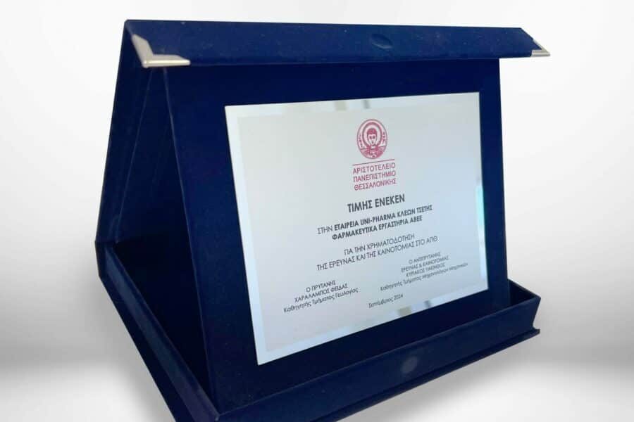 Η UNI-PHARMA – ΚΛΕΩΝ ΤΣΕΤΗΣ ΑΒΕΕ – Φαρμακευτικά Εργαστήρια, έλαβε από το Αριστοτέλειο πανεπιστήμιο Θεσσαλονίκης, μία σημαντική διάκριση «ΤΙΜΗΣ ΕΝΕΚΕΝ».  Τη τημιτική πλακέτα παρέλαβε η πρόεδρος της CEO του Ομίλου Φαρμακευτικών Επιχειρήσεων Τσέτη φαρμακοποιός MSc, Επίτιμη Δρ Φαρμακευτικής του ΕΚΠΑ & του παν. Πατρών Ιουλία Τσέτη.