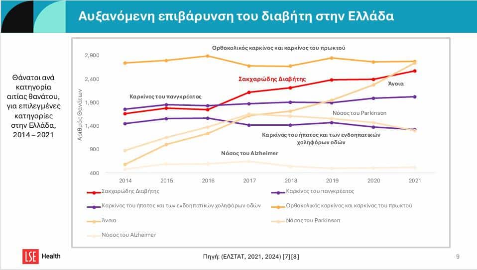 - οι θάνατοι από το διαβήτη αυξάνονται όμως δεν έχουμε ακόμη τη συνολική εικόνα (καθώς μετρούνται μόνο οι θάνατοι που στο πιστοποιητικό θανάτου αναγράφεται ο διαβήτης) . Ο διαβήτης περιλαμβάνεται στις δέκα βασικότερες αιτίες θανάτου και το ποσοστό θανάτων από τη νόσο από 1,4% έχει ανέβει στο 2%.