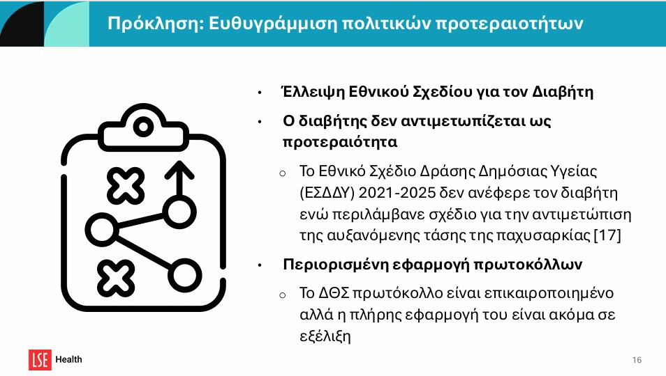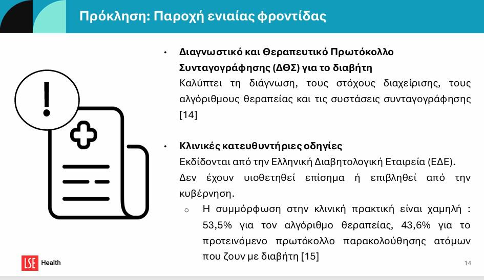 Χρειάζονται ολοκληρωμένες στρατηγικές φροντίδας που στοχεύουν σε αυτές τις αλληλένδετες προκλήσεις υγείας. Στην Ελλάδα θα πρέπει να αντιμετωπιστεί το αυξανόμενο βάρος του διαβήτη και να παρέχεται ολοκληρωμένη φροντίδα. Το σύστημα υγείας δεν προοδεύει με ρυθμό αρκετά σημαντικό ώστε να έχει τον αντίκτυπο που απαιτείται: Έχει περιορισμένες δυνατότητες συλλογής και ανάλυσης δεδομένων, γεγονός που καθιστά δύσκολη την πλήρη αποτίμηση του πραγματικού βάρους του διαβήτη και του σχετικού κόστους του.