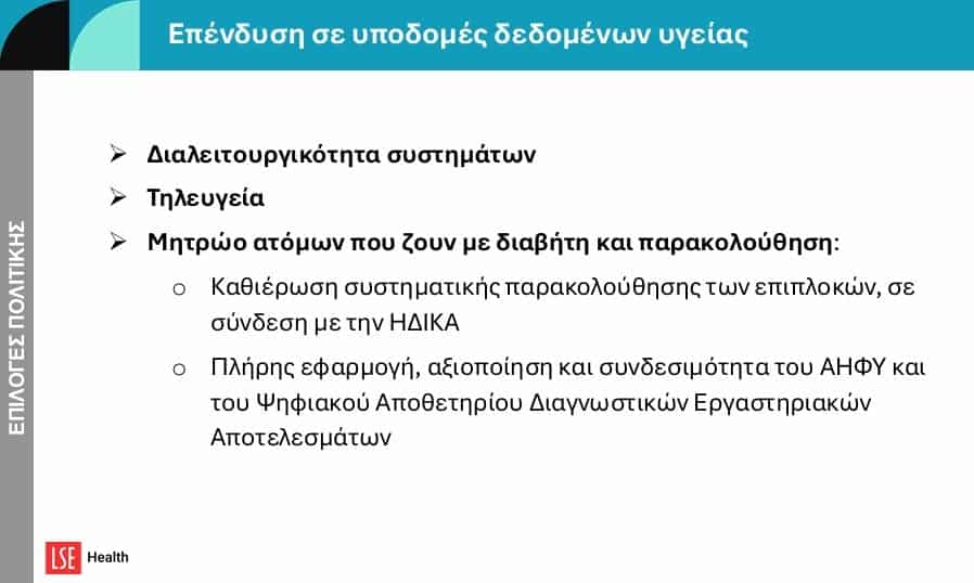 – Επένδυση στην Υποδομή Δεδομένων για Βελτίωση της Διαλειτουργικότητας και Ανάλυσης: Η βελτίωση της συλλογής δεδομένων, της ενσωμάτωσης και της αξιοποίησης τους είναι κρίσιμη για την λήψη αποφάσεων που βασίζονται σε δεδομένα και για την αποτελεσματική φροντίδα του διαβήτη.