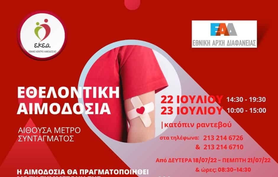 Έκκληση για εθελοντική προσφορά αίματος κάνει το Εθνικό Κέντρο Αιμοδοσίας για την κάλυψη αναγκών τους θερινούς μήνες. Η διήμερη δράση εθελοντικής αιμοδοσίας θα πραγματοποιηθεί στις 22 και στις 23 Ιουλίου στην αίθουσα Πολλαπλών Χρήσεων Σταθμού Μετρό Συντάγματος.