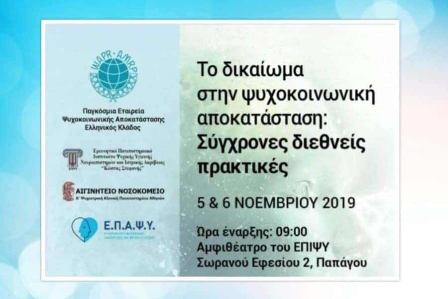 Με στόχο να αναδειχθεί το επιτακτικό ζήτημα της αποκατάστασης των ψυχικά ασθενών, ο Ελληνικός Κλάδος της WAPR σε συνεργασία με το ΕΠΙΨΥ, την Α’ Ψυχιατρική Κλινική της Ιατρικής Σχολής ΕΚΠΑ, Αιγινήτειο Νοσοκομείο και την ΕΠΑΨΥ διοργανώνουν διημερίδα στο ΕΠΙΨΥ στις 5 και στις 6 Νοεμβρίου.