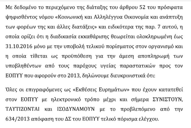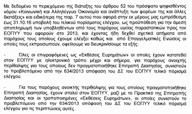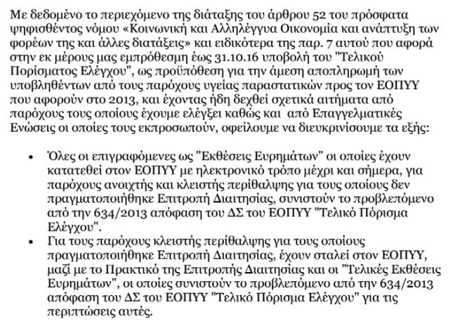 «Όλες οι επιγραφόμενες ως “Εκθέσεις Ευρημάτων” οι οποίες έχουν κατατεθεί στον ΕΟΠΥΥ με ηλεκτρονικό τρόπο μέχρι και σήμερα, για παρόχους ανοιχτής και κλειστής περίθαλψης για τους οποίους δεν πραγματοποιήθηκε Επιτροπή Διαιτησίας, συνιστούν το προβλεπόμενο από την 634/2013 απόφαση του ΔΣ του ΕΟΠΥΥ “Τελικό Πόρισμα Ελέγχου”», αναφέρεται ενδεικτικά. Αντίστοιχα, “Τελικό Πόρισμα Ελέγχου” θεωρούνται και οι αντίστοιχες εκθέσεις για τους παρόχους κλειστής περίθαλψης για τους οποίους πραγματοποιήθηκε Επιτροπή Διαιτησίας και οι οποίες συνοδεύονταν και από το πρακτικό της επιτροπής.