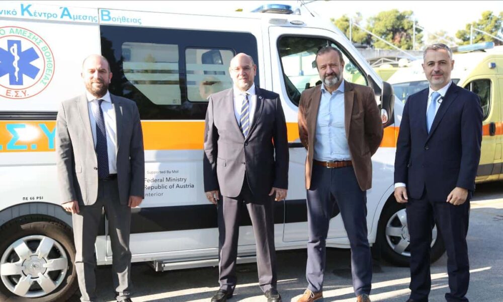 Πέντε ασθενοφόρα προσέφερε στην Κεντρική Υπηρεσία του ΕΚΑΒ Αθήνας ο Διεθνής Οργανισμός Μετανάστευσης (ΔΟΜ) Ελλάδας (International Organization for Migration (IOM) Greece) με τη χρηματοδότηση του Ομοσπονδιακού Υπουργείου Εσωτερικών της Δημοκρατίας της Αυστρίας. Τα πέντε οχήματα θα μεταφερθούν σε Χίο, Λέσβο, Σάμο, Κω και Λέρο, πέντε νησιά που έχουν συμβάλλει στην αντιμετώπιση της μεταναστευτικής κρίσης.