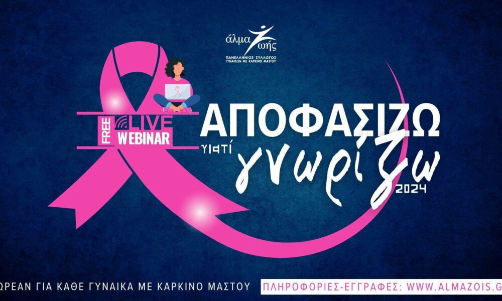Από τον προσεχή Απρίλιο έως τον Δεκέμβριο του 2024, επιλεγμένες Τετάρτες, θα πραγματοποιηθούν δωρεάν εκπαιδευτικά webinars για τον καρκίνο του μαστού από τον Πανελλήνιο Σύλλογο Γυναικών με καρκίνο Μαστού «Άλμα Ζωής». Ο κύκλος των διαδικτυακών σεμιναρίων έχει τίτλο «Αποφασίζω γιατί Γνωρίζω».