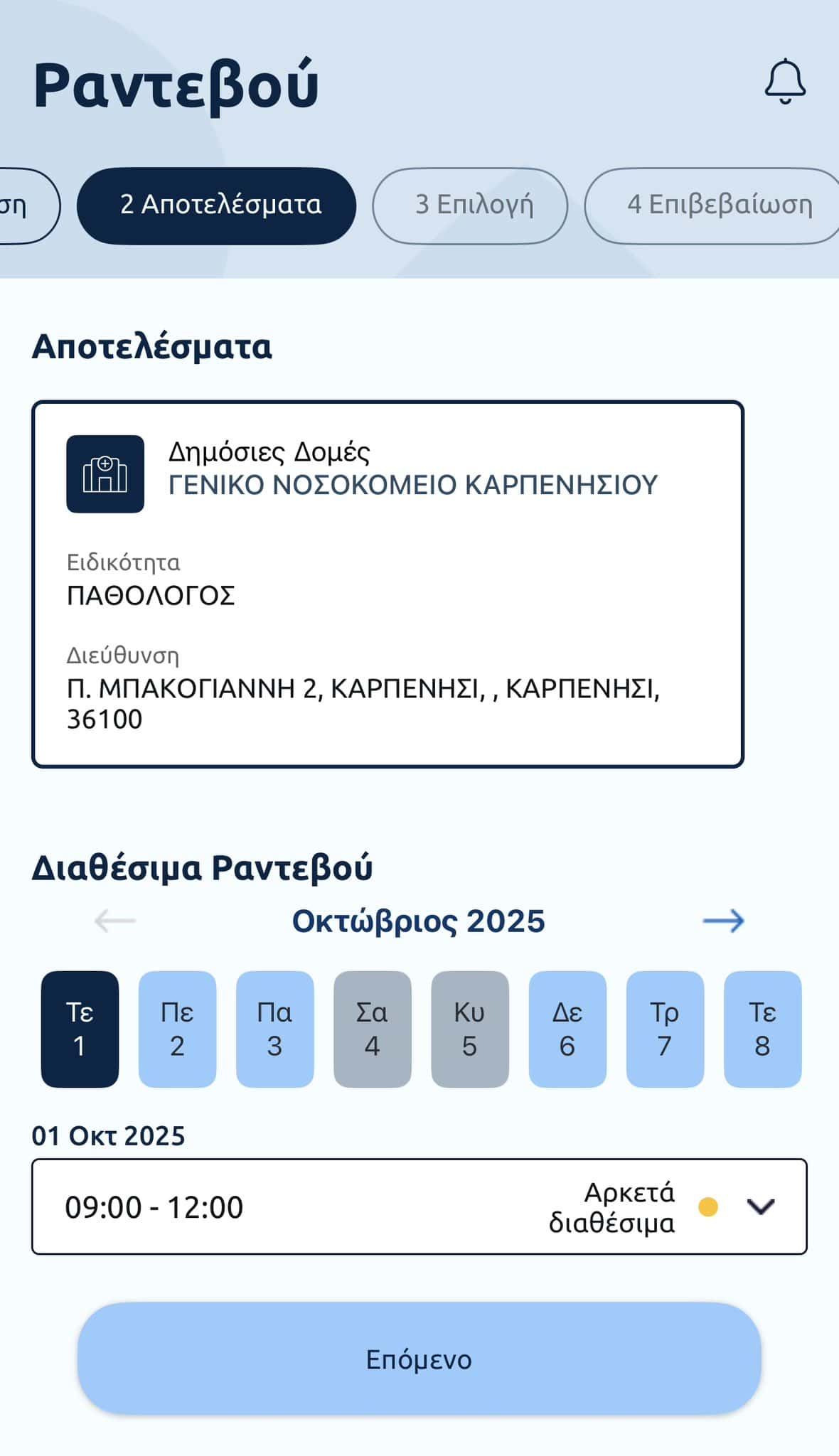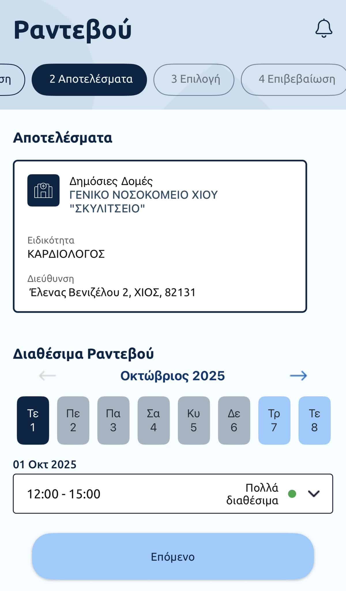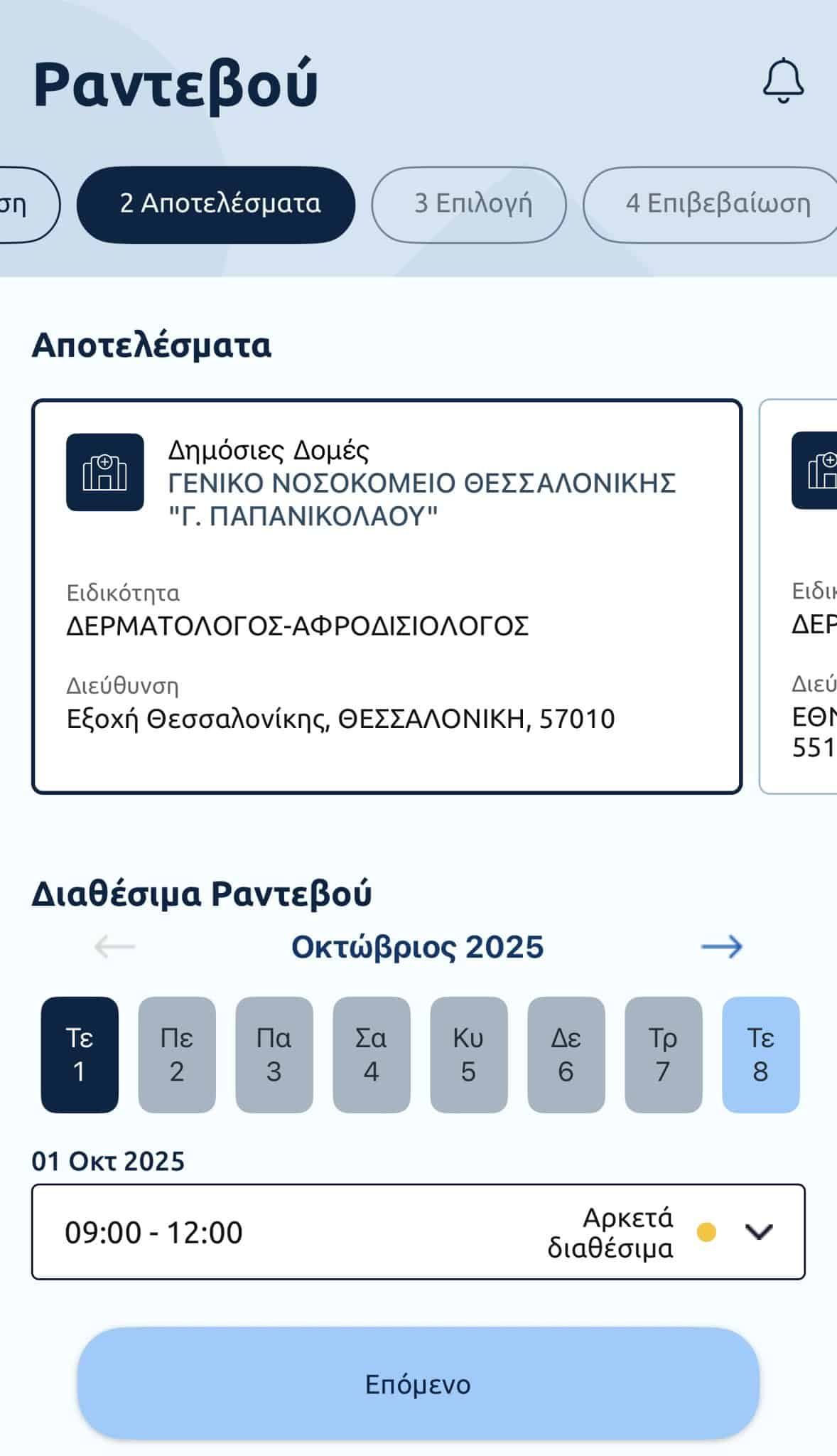 Από σήμερα, οι πολίτες μπορούν να κλείνουν δωρεάν ραντεβού με γιατρούς κάθε ειδικότητας σε δημόσια νοσοκομεία του ΕΣΥ, μέσω της ηλεκτρονικής πλατφόρμας finddoctors.gov.gr, της εφαρμογής myHealth ή καλώντας τον δωρεάν αριθμό 1566 του Υπουργείου Υγείας. Η διαδικασία είναι απλή και φιλική προς τον χρήστη: επιλέγοντας «Νέο Ραντεβού», «Ραντεβού με Ιατρό», «Ραντεβού σε Δημόσιες Δομές», την επιθυμητή ειδικότητα και τον νομό, το σύστημα πραγματοποιεί αυτόματα την αναζήτηση διαθέσιμων ραντεβού.
