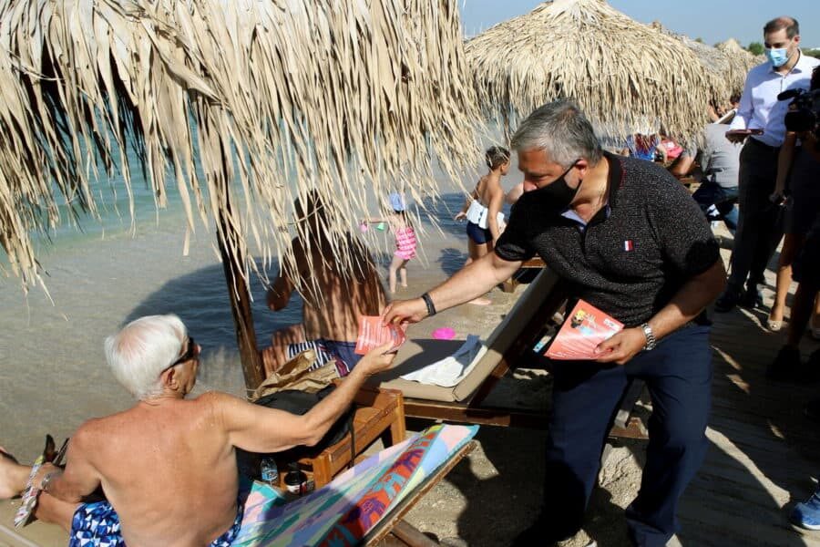Σημερινή δράση ενημέρωσης για τον κοροναϊό περιλάμβανε τη διανομή ενημερωτικών φυλλαδίων και αντισηπτικών στους λουόμενους, στο πλαίσιο των συντονισμένων δράσεων εποπτείας και ελέγχου για την τήρηση των μέτρων ασφαλείας των πολιτών στις παραλίες της Αττικής.