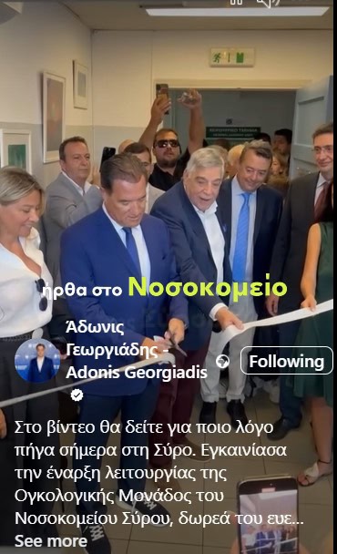 Ο υπουργός Υγείας Άδωνις Γεωργιάδης επισκέφθηκε τη Σύρο και εγκαινίασε τη νέα Ογκολογική Μονάδα του Νοσοκομείου “Βαρδάκειο και Πρώιο”, μια σημαντική δωρεά του Αντώνη Κομνηνού που καλύπτει ένα πάγιο αίτημα των ογκολογικών ασθενών του νησιού. Από την 1η Οκτωβρίου, οι θεραπείες θα πραγματοποιούνται πλέον στη Σύρο, χωρίς να απαιτείται μετακίνηση στην Αθήνα, προσφέροντας αξιοπρέπεια και ανακούφιση στους κατοίκους των Κυκλάδων.