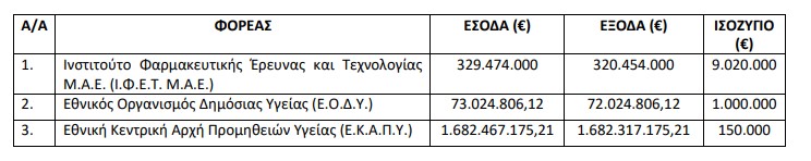 Το «πράσινο φως» δόθηκε για τους προϋπολογισμούς των φορέων Ινστιτούτο Φαρμακευτικής Έρευνας και Τεχνολογίας Μ.Α.Ε. (Ι.Φ.Ε.Τ. Μ.Α.Ε.), Εθνικού Οργανισμού Δημόσιας Υγείας (Ε.Ο.Δ.Υ.) και Εθνικής Κεντρικής Αρχής Προμηθειών Υγείας (Ε.Κ.Α.Π.Υ.) έτους 2025.