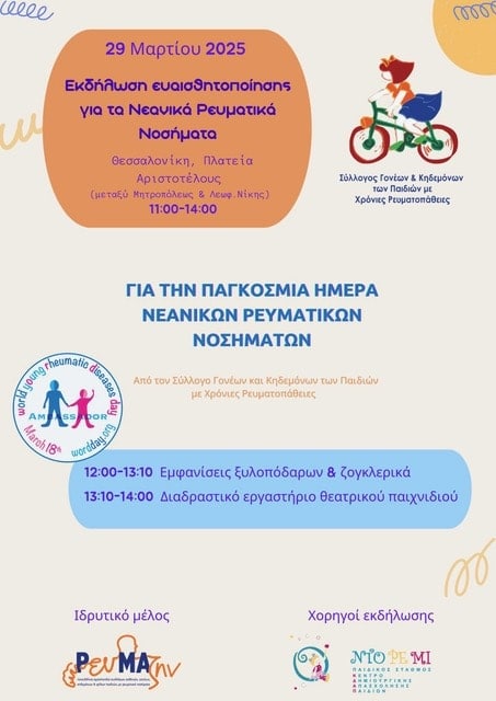Ο Σύλλογος Γονέων και Κηδεμόνων των Παιδιών με Χρόνιες Ρευματοπάθειες διοργανώνει εκδήλωση ευαισθητοποίησης στη Θεσσαλονίκη, με αφορμή την Παγκόσμια Ημέρα Νεανικών Ρευματικών Νοσημάτων (WORD Day).
