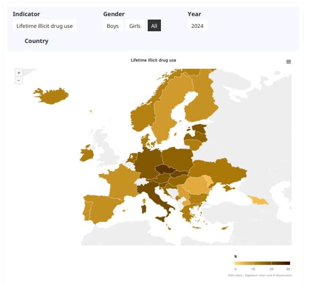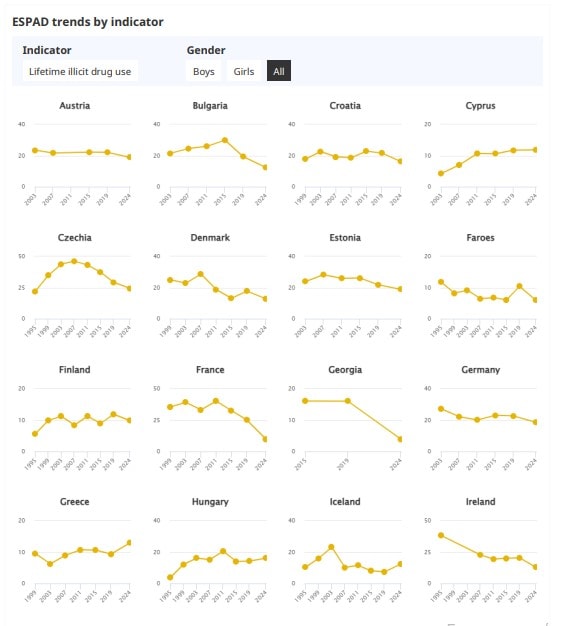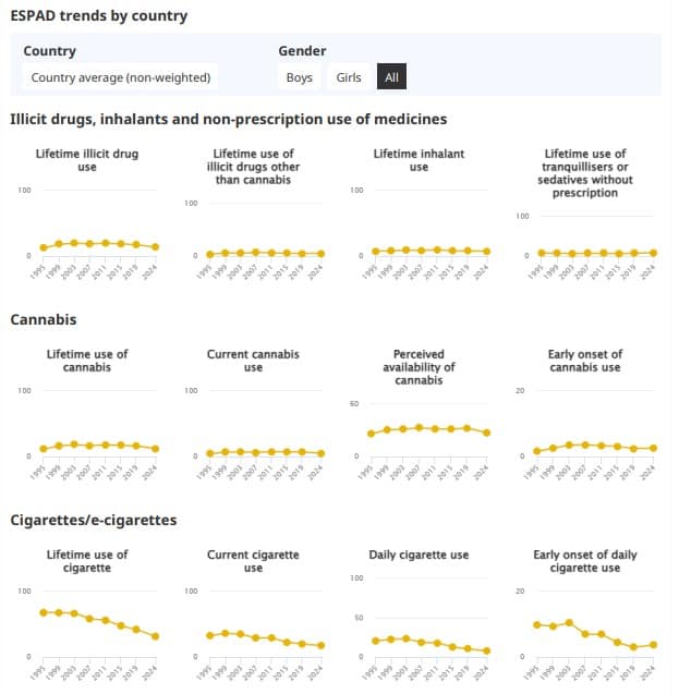 Έχει μειωθεί μεταξύ των μαθητών της ESPAD, με τις διαφορές μεταξύ των φύλων να περιορίζονται, αν και τα αγόρια εξακολουθούν να αναφέρουν υψηλότερη χρήση και διαθεσιμότητα. Παράλληλα, η χρήση εισπνεόμενων ουσιών αυξάνεται μεταξύ των κοριτσιών, ενώ η μη ιατρική χρήση φαρμάκων παρουσιάζει επίσης αύξηση.