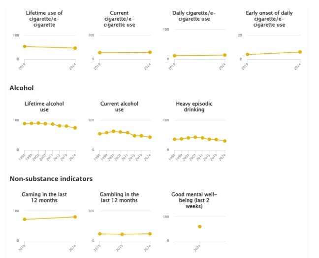 Έχει επίσης μειωθεί με την πάροδο του χρόνου, τόσο σε επίπεδο συνολικής χρήσης όσο και σε επεισόδια υπερβολικής κατανάλωσης. Ωστόσο, η μείωση είναι πιο έντονη στους αγόρια, ενώ τα κορίτσια παρουσιάζουν πιο σταθερή τάση. Παρά την πρόοδο, το αλκοόλ παραμένει εύκολα προσβάσιμο και η πρώιμη έναρξη και η υπερβολική κατανάλωση εξακολουθούν να αποτελούν σημαντικά ζητήματα σε ορισμένες περιοχές.