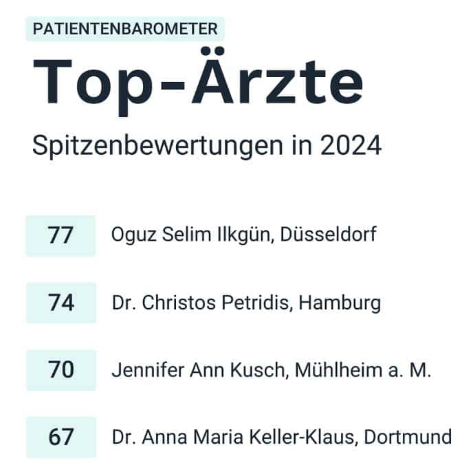 Από τη τελευταία αξιολόγηση της jameda μπορούμε να κατανοήσουμε γιατί οι ασθενείς εμπιστεύονται ιδιαίτερα τους χειρουργούς και τους ψυχολόγους τους, αλλά ένας γιατρός ΩΡΛ του Ντίσελντορφ εν τέλει συγκέντρωσε τις περισσότερες κορυφαίες βαθμολογίες. Η διάκρισή αυτή μπορεί να μας δείξει τι πραγματικά μετράει για την ικανοποίηση των ασθενών. Με 77 κορυφαίες αξιολογήσεις και μέσο όρο πέντε αστέρων, ο Oguz Ilkgün είναι ο πιο δημοφιλής γιατρός στη Γερμανία το 2024. Όπως εξήγησε ο ίδιος μαζί με την ομάδα του ακούνε τους ασθενείς και διαθέτουν χρόνο σε αυτούς από την εξέτασης έως τη μετεγχειρητική φροντίδα. Επίσης ο γιατρός κερδίζει την εμπιστοσύνη των ασθενών, όπως αποσαφήνισε, με το να ενημερώνει τις γνώσεις του για το αντικείμενό του.