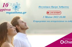 Σημειώνεται ότι σήμερα θα πραγματοποιηθεί στις 18.00 ζωντανή διαδικτυακή εκδήλωση (Live Event) στη σελίδα Facebook του myasthma.gr., στο πλαίσιο της Παγκόσμιας Ημέρας Άσθματος.