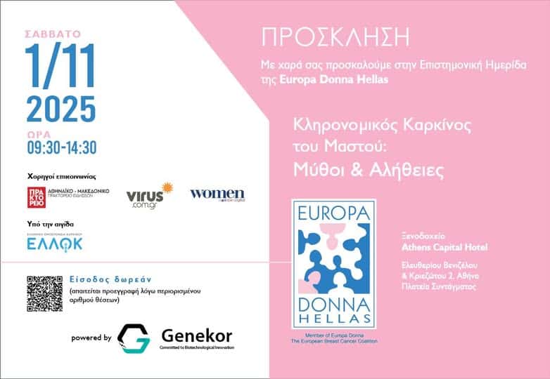 Το Σάββατο 1 Νοεμβρίου 2025, η Europa Donna Hellas διοργανώνει ημερίδα με θέμα «Κληρονομικός Καρκίνος Μαστού: Μύθοι και Αλήθειες» στο Athens Capital Hotel, με στόχο την ενημέρωση και την αποδόμηση των παρανοήσεων γύρω από τη γενετική προδιάθεση. Η εκδήλωση τελεί υπό την αιγίδα της ΕΛΛΟΚ και πραγματοποιείται με την υποστήριξη της Genekor Medical S.A.