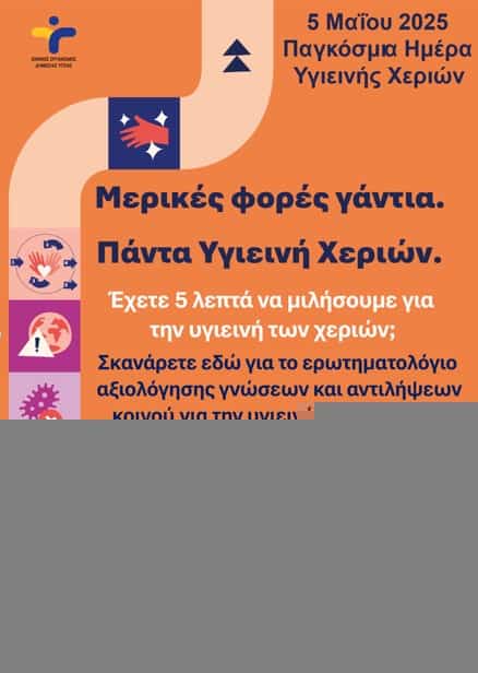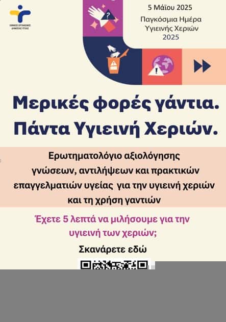 Με το μήνυμα «Μερικές φορές γάντια. Πάντα Υγιεινή Χεριών», ο Εθνικός Οργανισμός Δημόσιας Υγείας (ΕΟΔΥ) συμμετέχει στον εορτασμό. Τα βασικά μηνύματα για την Παγκόσμια Ημέρα Υγιεινής Χεριών, όπως διαμορφώθηκαν από τον Παγκόσμιο Οργανισμός Υγείας (ΠΟΥ), είναι τα εξής: