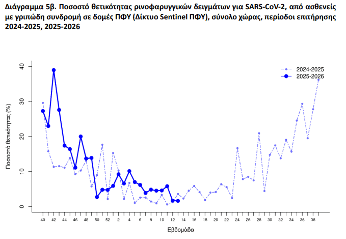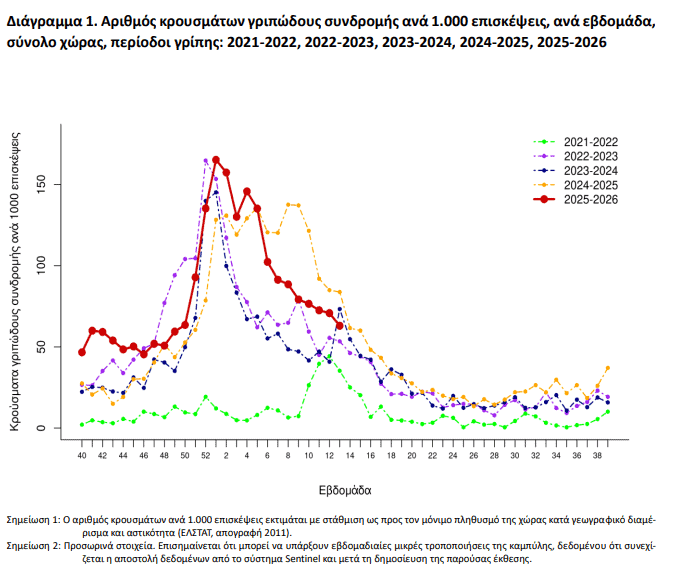 Δεν καταγράφηκαν νέες διασωληνώσεις, ενώ σημειώθηκαν δύο θάνατοι. Συνολικά, από τις αρχές του 2025 έως την εβδομάδα 13/2026, οι θάνατοι σε σοβαρά περιστατικά ανέρχονται σε 91.