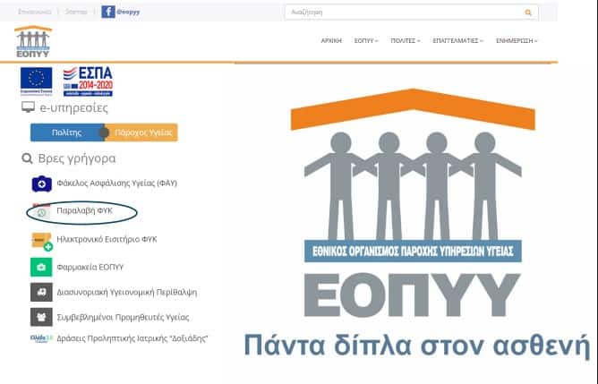 Αρχικά ο ασφαλισμένος θα πρέπει να επισκεφθεί την Κεντρική Σελίδα ΕΟΠΥΥ. Από εκεί θα επιλέξει τον υπερσύνδεσμο «Παραλαβή ΦΥΚ». Στη συνέχεια εμφανίζεται η σελίδα και ο ασφαλισμένος επιλέγει «Aποστολή κατ’οίκον» ή πατά «ΣΥΝΔΕΣΗ ΜΕΣΩ TAXISNET».