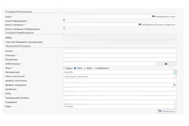 Ο ΕΟΠΥΥ συνιστά σε αυτό το σημείο προσοχή καθώς ο Τ.Κ. της Διεύθυνσής αναγράφεται χωρίς κενά πριν και ενδιάμεσα π.χ 15123. Την πρώτη φορά κατά την συμπλήρωση των στοιχείων επικοινωνίας θα ζητήσει το σύστημα επιβεβαίωση του email και του κινητού τηλεφώνου. Η συμπλήρωση όλων των στοιχείων είναι υποχρεωτική.
