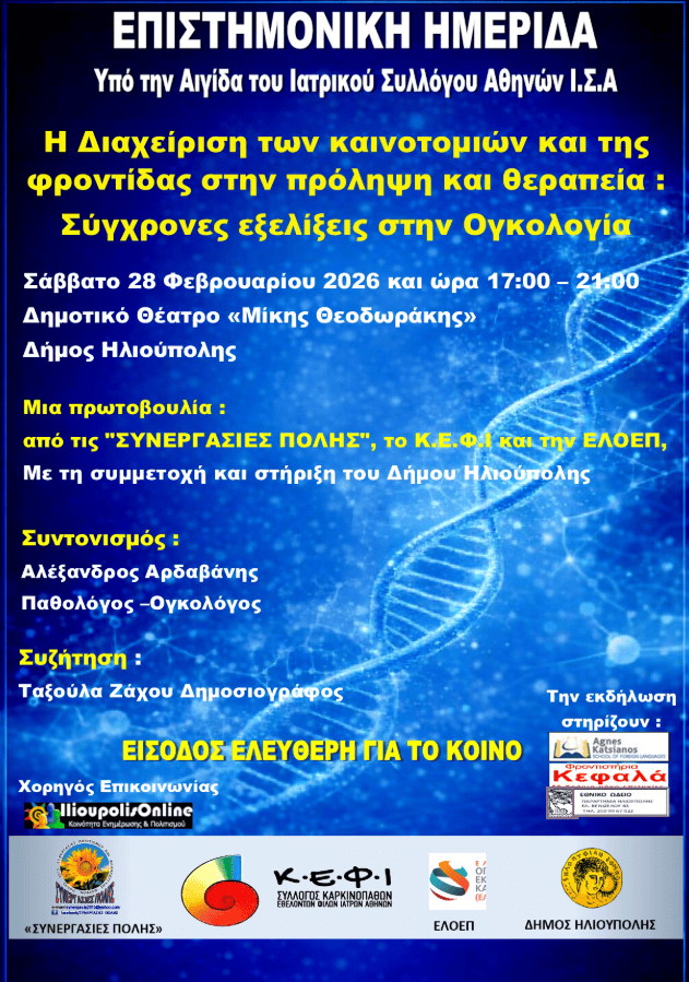 Οι «Συνεργασίες Πόλης» – ένα δίκτυο 13 κοινωνικών συλλογικών φορέων της Ηλιούπολης – ο Σύλλογος Καρκινοπαθών, Εθελοντών, Φίλων, Ιατρών «Κ.Ε.Φ.Ι.» Αθηνών και η ΕΛΟΕΠ, με τη συμμετοχή και υποστήριξη του Δήμου Ηλιούπολης, διοργανώνουν την εσπερίδα με θέμα: