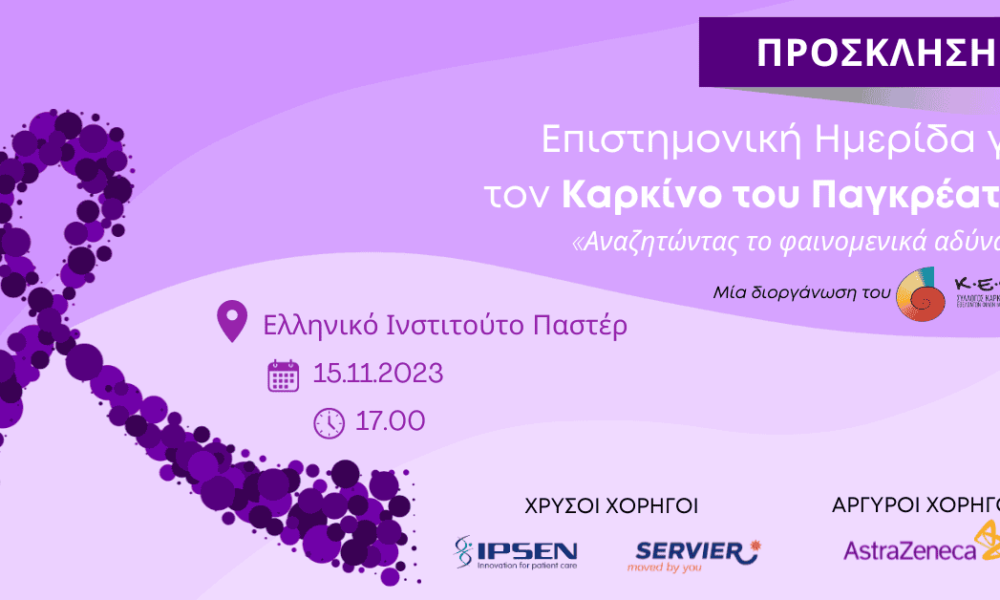 Επιστημονική Ημερίδα με θέμα «ΠΑΓΚΟΣΜΙΑ ΗΜΕΡΑ ΓΙΑ ΤΟΝ ΚΑΡΚΙΝΟ ΤΟΥ ΠΑΓΚΡΕΑΤΟΣ – Αναζητώντας το φαινομενικά αδύνατο» θα πραγματοποιηθεί από τον Σύλλογο Καρκινοπαθών, Εθελοντών, Φίλων, Ιατρών «Κ.Ε.Φ.Ι.» Αθηνών. Η εκδήλωση θα διεξαχθεί την προσεχή Τετάρτη 15 Νοεμβρίου 2023 και ώρα 17:30 – 21:00, στο αμφιθέατρο του Ινστιτούτου ΠΑΣΤΕΡ.