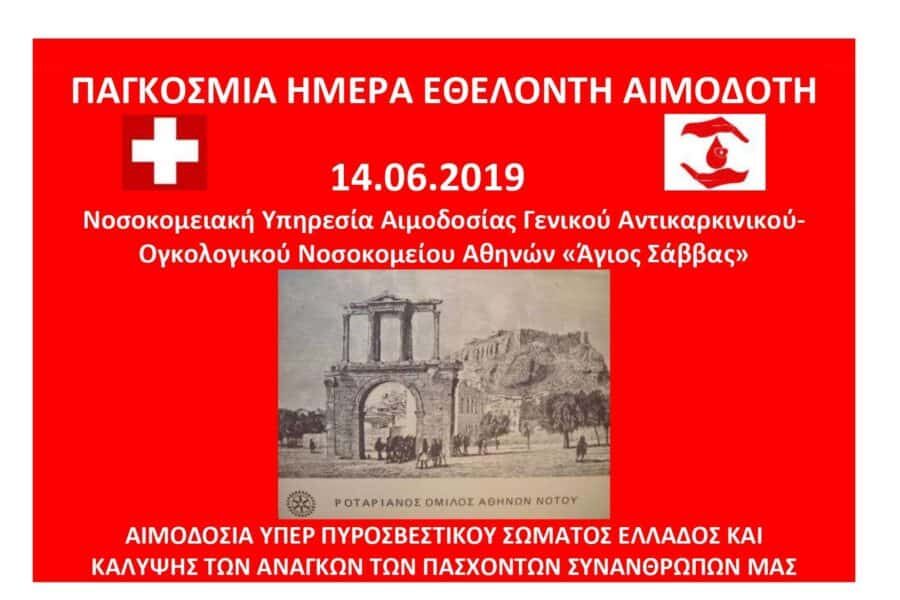 Με αφορμή τις εκτεταμένες καλοκαιρινές ανάγκες σε αίμα ο Ροταριανός Όμιλος Αθήναι-Νότος σε συνεργασία με την Νοσοκομειακή Υπηρεσία Αιμοδοσίας του Γενικού Αντικαρκινικού-Ογκολογικού Νοσοκομείου Αθηνών «Άγιος Σάββας» διοργανώνει Εθελοντική Αιμοδοσία υπέρ του  Πυροσβεστικού Σώματος Ελλάδος καθώς και για την κάλυψη αναγκών των πασχόντων.