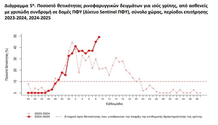 σε ΜΕΘ και 50 θάνατοι από εργαστηριακά επιβεβαιωμένη γρίπη. Από την εβδομάδα 01/2024 έως την εβδομάδα 09/2025,