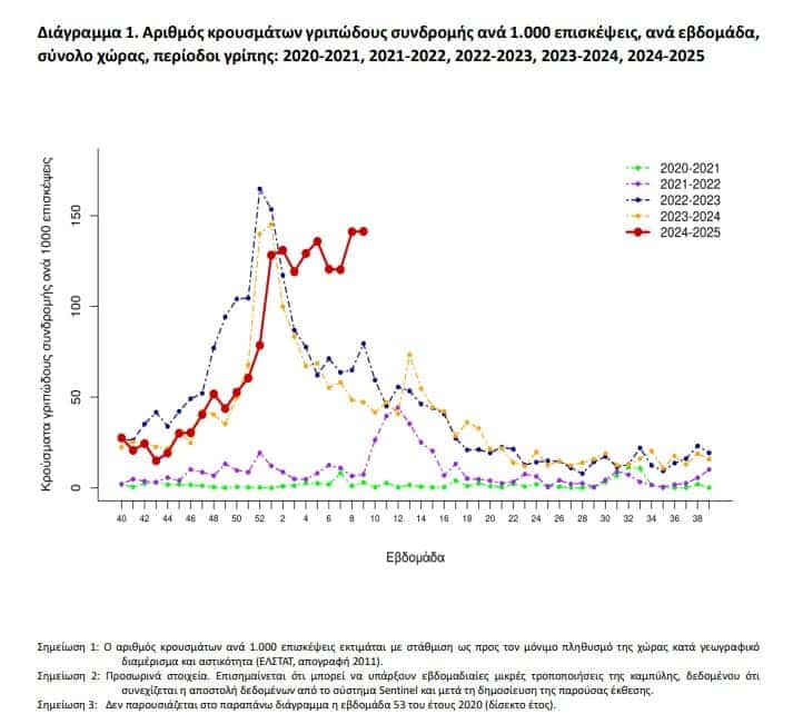 40/2024 έως την εβδομάδα 09/2025 έχουν καταγραφεί 154 εργαστηριακά επιβεβαιωμένα κρούσματα γρίπης με νοσηλεία