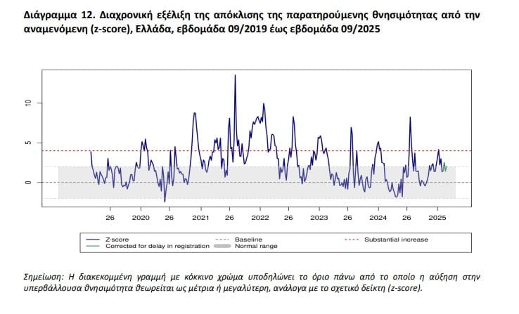 εβδομάδες ήταν 12. Από την εβδομάδα 01/2024 μέχρι την εβδομάδα 09/2025 οι καταγεγραμμένοι θάνατοι σε σοβαρά