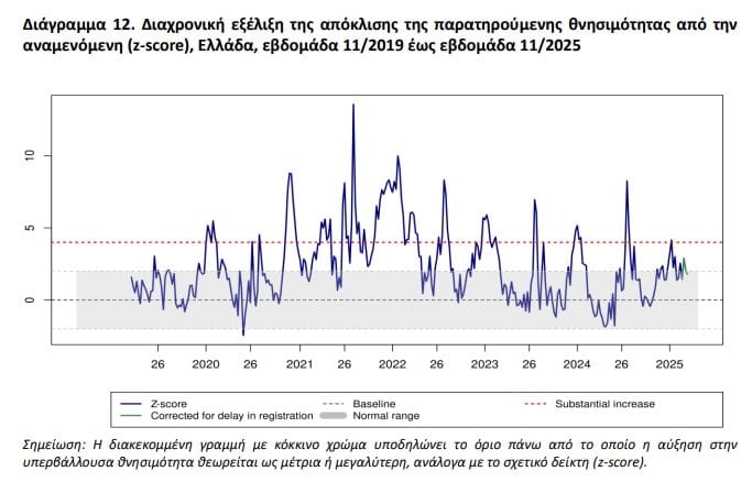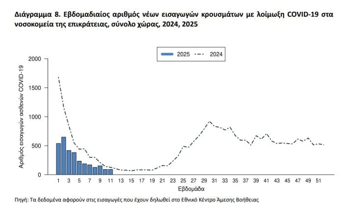 ✓ Κατά την εβδομάδα 11/2025 καταγράφηκαν δύο νέα σοβαρά κρούσματα με νοσηλεία σε ΜΕΘ, ενώ δεν καταγράφηκαν