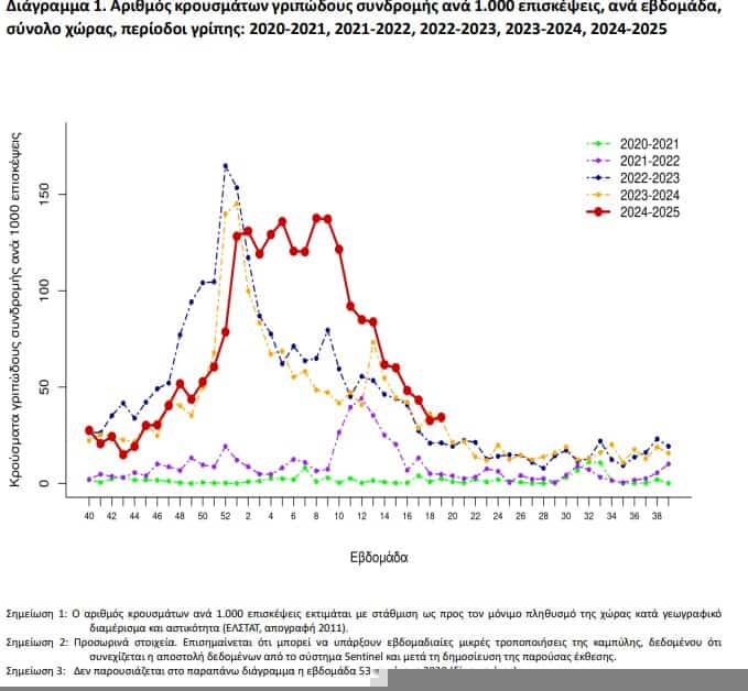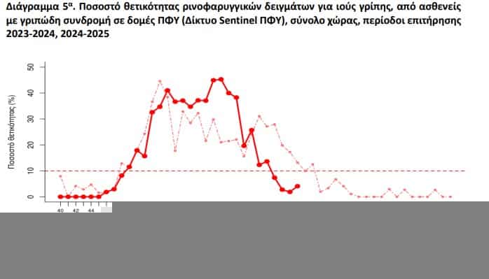 Σε ότι αφορά στη γρίπη η θετικότητα υποχωρήσει κάτω από το όριο που σηματοδοτεί την εποχική δραστηριότητα της γρίπης.