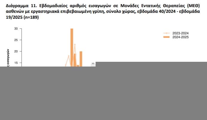 ✓ Κατά την εβδομάδα 19/2025 δεν καταγράφηκαν νέα σοβαρά κρούσματα με νοσηλεία σε ΜΕΘ ούτε νέοι θάνατοι από εργαστηριακά επιβεβαιωμένη γρίπη. Συνολικά, από την εβδομάδα 40/2024 έως την εβδομάδα 19/2025 έχουν καταγραφεί 189 εργαστηριακά επιβεβαιωμένα κρούσματα γρίπης με νοσηλεία σε ΜΕΘ και 79 θάνατοι από εργαστηριακά επιβεβαιωμένη γρίπη. Από την εβδομάδα 01/2024 έως την εβδομάδα 19/2025, οι καταγεγραμμένοι θάνατοι σε σοβαρά