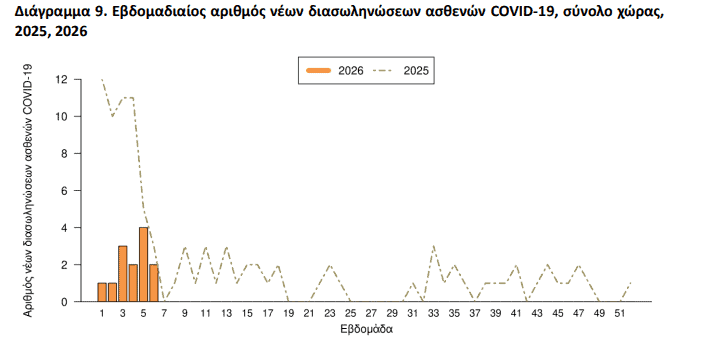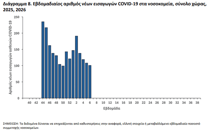Η θετικότητα στα διαγνωστικά τεστ για SARS‑CoV‑2 παρέμεινε στα ίδια επίπεδα με την προηγούμενη εβδομάδα. Στο πλαίσιο της ενεργητικής επιτήρησης σε 84 νοσοκομεία, καταγράφηκαν 101 νέες εισαγωγές COVID‑19, έναντι 108 την εβδομάδα 05/2026. Επίσης, καταγράφηκαν δύο νέες διασωληνώσεις και επτά θάνατοι, ενώ από την αρχή του 2025 έως σήμερα οι θάνατοι σε σοβαρά περιστατικά ανέρχονται σε 87.