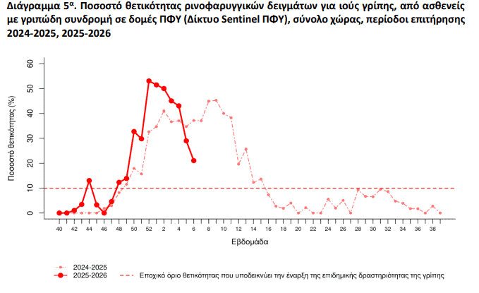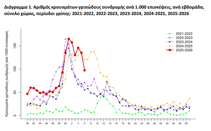Την εβδομάδα 06/2026 δηλώθηκαν 13 νέα σοβαρά κρούσματα με νοσηλεία σε ΜΕΘ και 15 θάνατοι από εργαστηριακά επιβεβαιωμένη γρίπη. Συνολικά, από την εβδομάδα 40/2025 έχουν καταγραφεί 136 σοβαρά κρούσματα και 60 θάνατοι, ενώ από την αρχή του 2025 οι θάνατοι σε σοβαρά περιστατικά ανέρχονται σε 144.