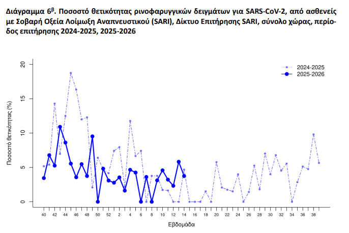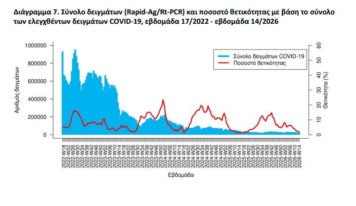 Η θετικότητα από τους διαγνωστικούς ελέγχους SARS‑CoV‑2 παραμένει σε πολύ χαμηλά επίπεδα, παρουσιάζοντας μικρή επιπλέον μείωση. Στο πλαίσιο της ενεργητικής επιτήρησης σε 84 νοσοκομεία, καταγράφηκαν 34 νέες εισαγωγές COVID‑19, έναντι 46 την προηγούμενη εβδομάδα. Δεν σημειώθηκαν νέες διασωληνώσεις, ενώ καταγράφηκαν τρεις θάνατοι. Από την εβδομάδα 01/2025 έως και την εβδομάδα 14/2026 έχουν καταγραφεί συνολικά 91 θάνατοι σε σοβαρά περιστατικά.