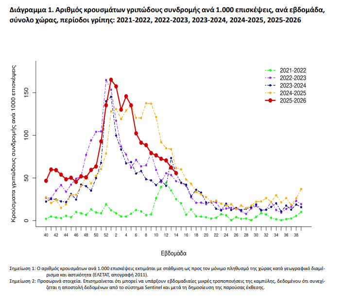 Η γριπώδης συνδρομή (ILI) συνεχίζει την πτωτική της πορεία, η οποία ξεκίνησε μετά την εβδομάδα 04/2026. Και την εβδομάδα 14/2026 σημειώθηκε περαιτέρω μείωση των περιστατικών ανά 1.000 επισκέψεις. Αντίστοιχα, τα περιστατικά σοβαρής οξείας λοίμωξης του αναπνευστικού (SARI) παραμένουν σε χαμηλά επίπεδα, με μικρές διακυμάνσεις, ενώ την ίδια εβδομάδα καταγράφηκε νέα μείωση σε σχέση με την προηγούμενη.
