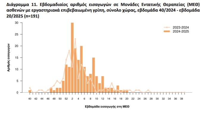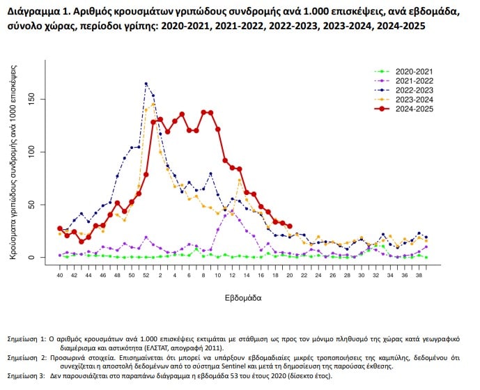 εργαστηριακά επιβεβαιωμένη γρίπη. Συνολικά, από την εβδομάδα 40/2024 έως την εβδομάδα 20/2025 έχουν καταγραφεί