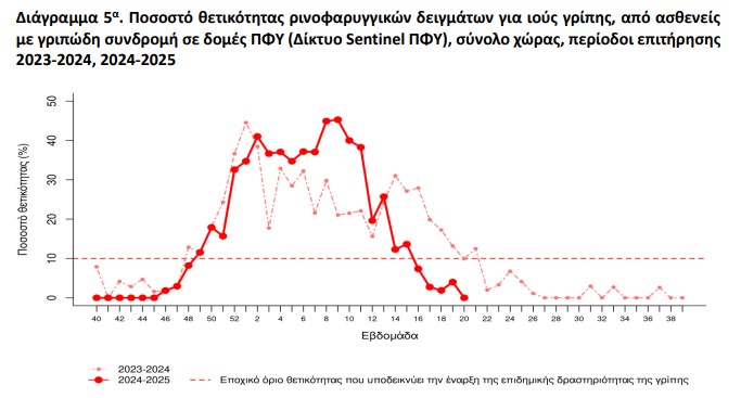 Σε ότι αφορά στη γρίπη η θετικότητα υποχωρήσει κάτω από το όριο που σηματοδοτεί την εποχική δραστηριότητα της γρίπης.