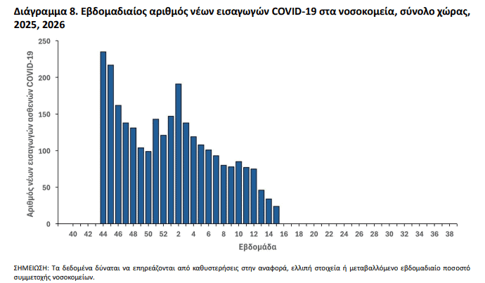 Δεν καταγράφηκαν νέες διασωληνώσεις ή θάνατοι, ενώ συνολικά από τις αρχές του 2025 έως την εβδομάδα 15/2026 έχουν σημειωθεί 91 θάνατοι σε σοβαρά περιστατικά. Παράλληλα, τα κυρίαρχα στελέχη που εντοπίζονται είναι τα NB.1.8.1, XFG και BA.3.2, χωρίς ενδείξεις αυξημένου κινδύνου σοβαρής νόσησης.